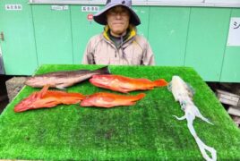 船外機ボートで杉浦さんがオオモンハタ、アカハタ、アオリイカをゲット。
