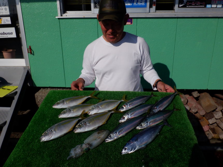 船外機ボートで吉田さんがシマアジ、ムロアジ、アオリイカをゲット。
