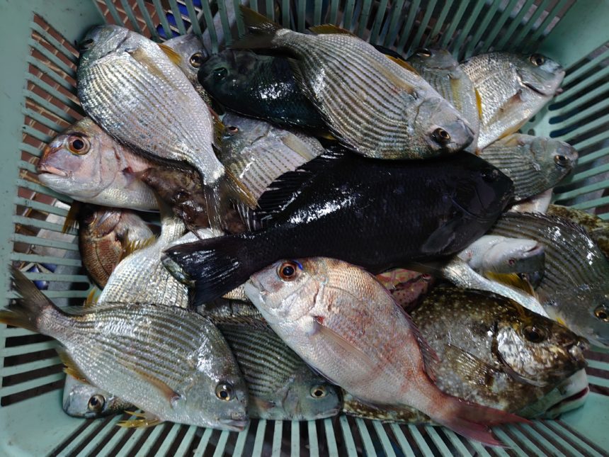 カセ釣りで上田さんがヘダイ、グレ、アイゴをゲット。