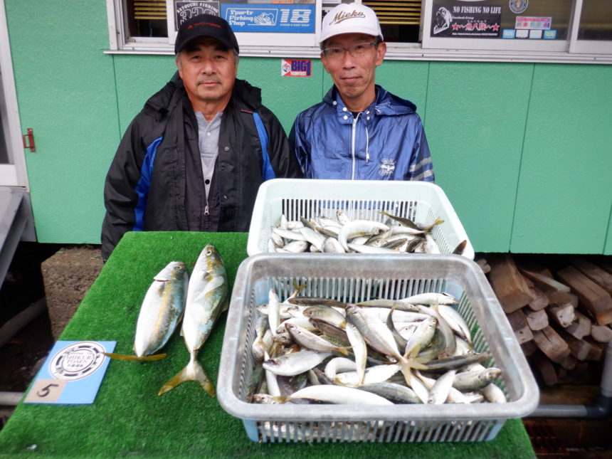 手漕ぎボートで高橋さんがツバス、サバ、アジ、カマスをゲット。