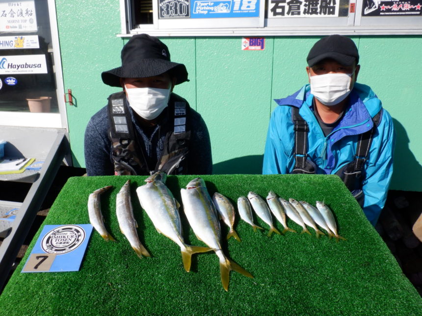 船外機ボートで藤巻さんがシマアジ、メイチ、ツバス、イサキをゲット。
