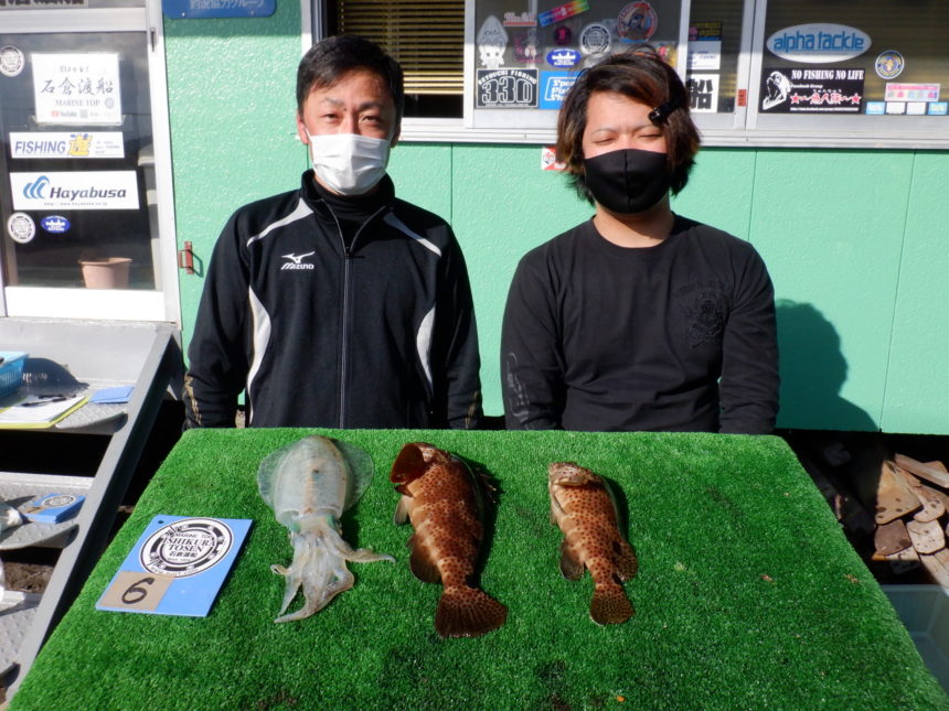 船外機ボートで荒木さんがアオリイカ、オオモンハタをゲット。