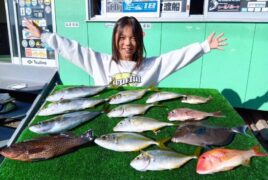 船外機ボートでことみちゃんがシマアジ、ツバス、マダイ、オオモンハタ、サンノジをゲット。
