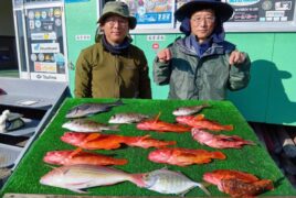 船外機ボートで山田さんがイトヨリ、グレ、アカハタ、イサキをゲット。