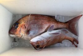 船外機ボートで北川さんがマダイをゲット。