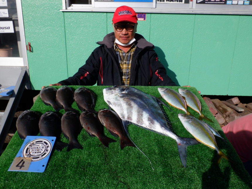 船外機ボートで松原さんがイトヒキアジ、グレ、シマアジをゲット。