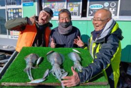 船外機ボートで犬塚さんがアオリイカをゲット。