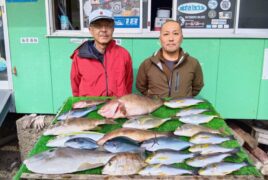 船外機ボートです小林さんがオオモンハタ、イサキ、メイチ、シマアジ、グレをゲット。
