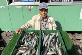 手漕ぎボートで鈴木さんがアジ、カマスをゲット。
