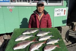 船外機ボートで佐藤さんがワラサ、ヒラメをゲット。