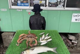 船外機ボートでY君がマダコ、アジ、ボラをゲット。