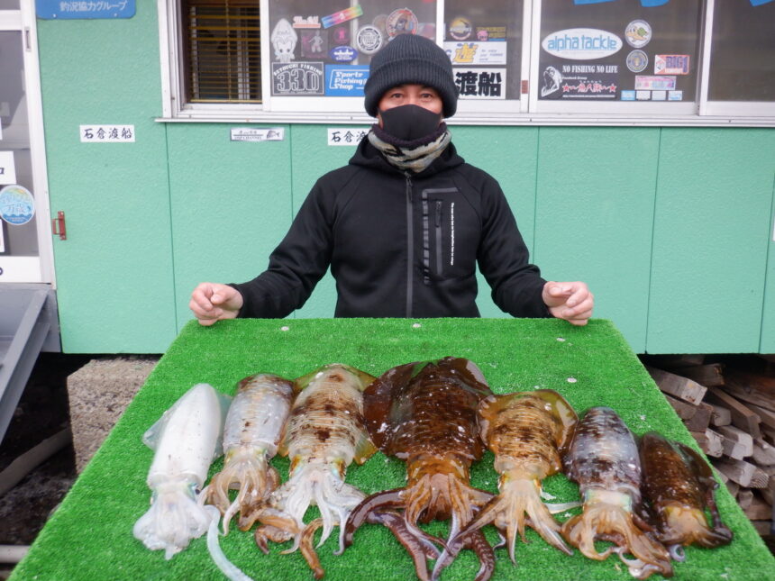 船外機ボートで岡部さんがアオリイカ1.1kgまでゲット。