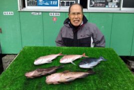 船外機ボートで中野さんがマダイ、グレ、オオモンハタをゲット。
