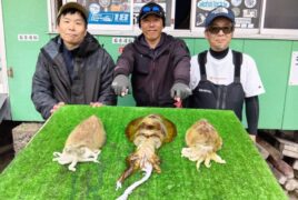 船外機ボートで吉田さんがアオリイカ、カミナリイカをゲット。