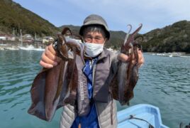 船外機ボートで若原さんがアオリイカをゲット。
