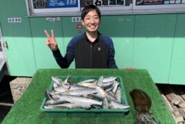 手漕ぎボートで岡崎さんがアオリイカ、アジをゲット。
