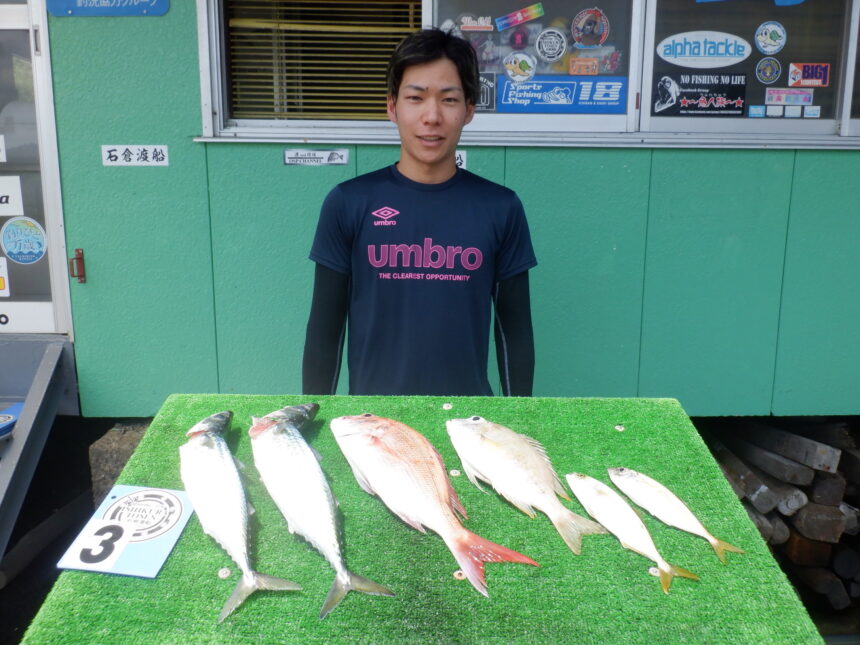 船外機ボートで岩下さんがマダイ40cmサバ、メイチをゲット。