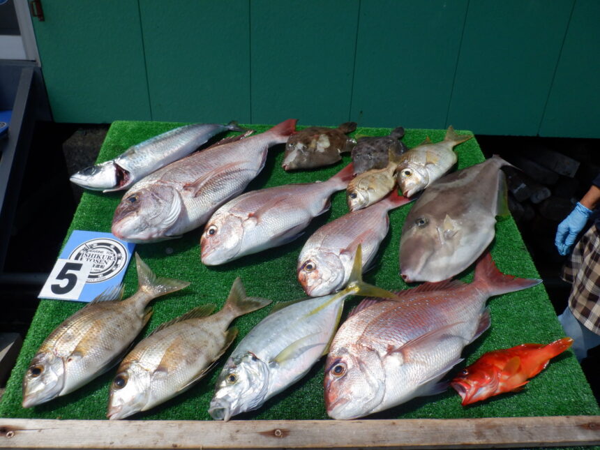 2022.06.10 UP ボート釣り釣果 船外機ボートで北村さんがマダイ57cmまでとメイチ、シマアジ、ウスバハギ、サバ、カワハギをゲット。 釣行日 2022年06月10日 釣り人 北村さん コメント カゴ天秤