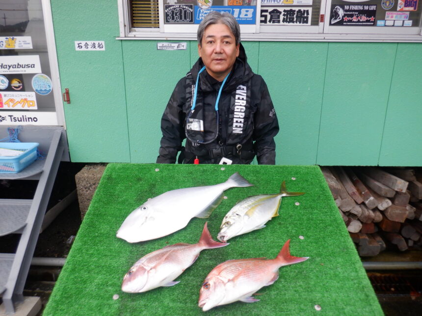船外機ボートで大野さんがマダイ、ウスバハギ、シマアジをゲット。