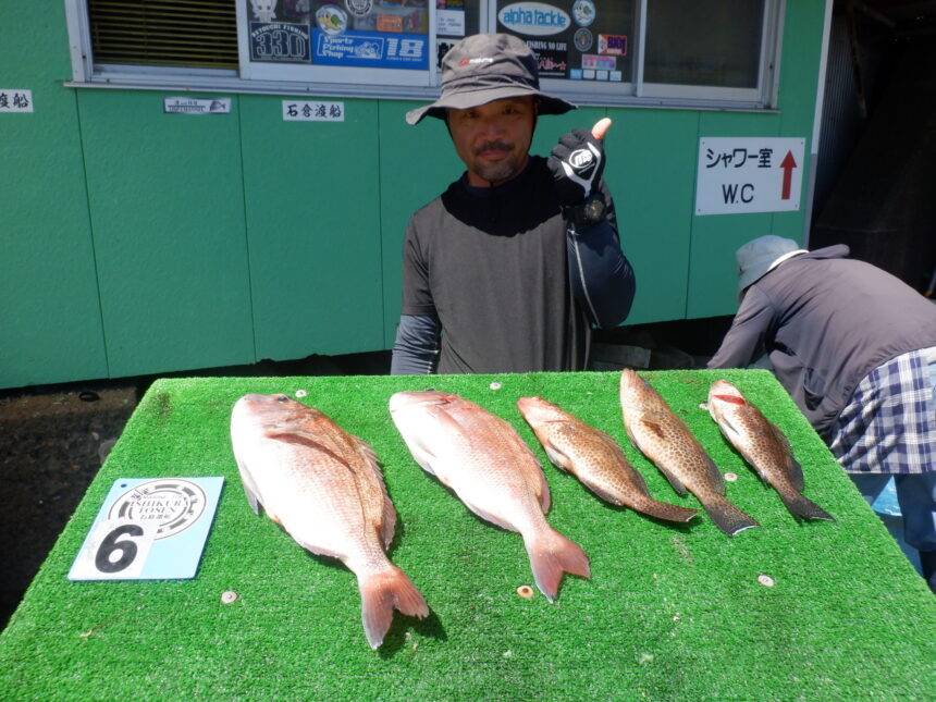 船外機ボートで水越さんがマダイ40cmまでとオオモンハタをゲット。