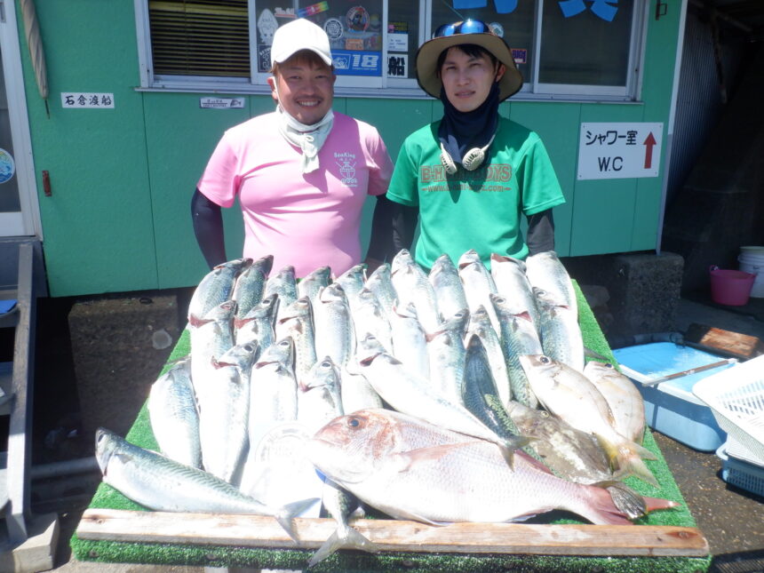 船外機ボートで石丸さんがマダイ55cmとメイチ、サバをゲット。