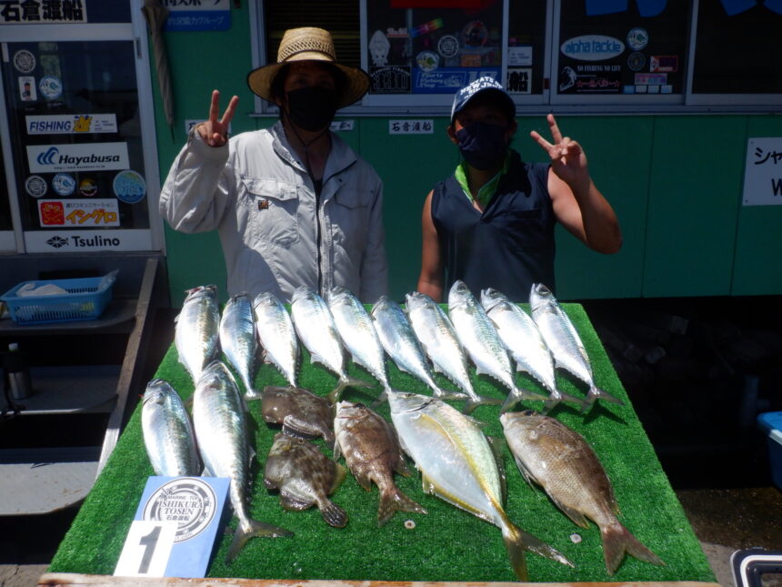 船外機ボートで新本さんがツバス、マダイ、アジ、カワハギをゲット。