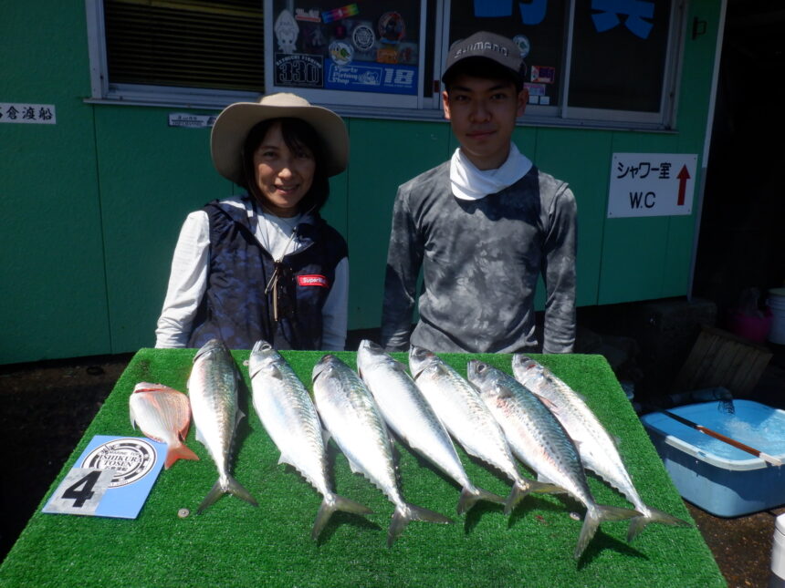船外機ボートで服部さんがサバ、マダイをゲット。