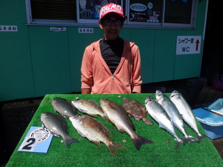 船外機ボートで中村さんがイサキ、メイチ、グレ、カワハギ、サバをゲット。