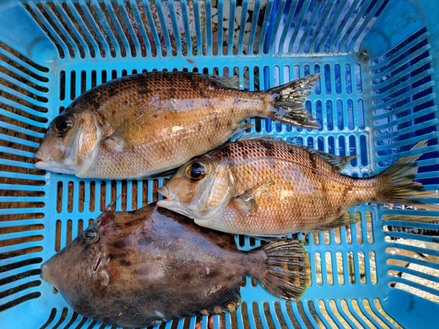 船外機ボートで北村さんがアジ、オオモンハタ、カワハギをゲット。