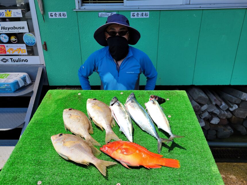 船外機ボートで要石さんがマダイ、グレ、イサキをゲット。
