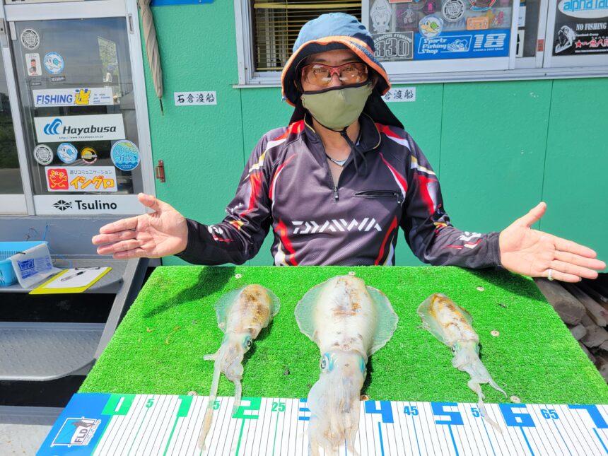 船外機ボートで木村さんがアオリイカ&カミナリイカをゲット。