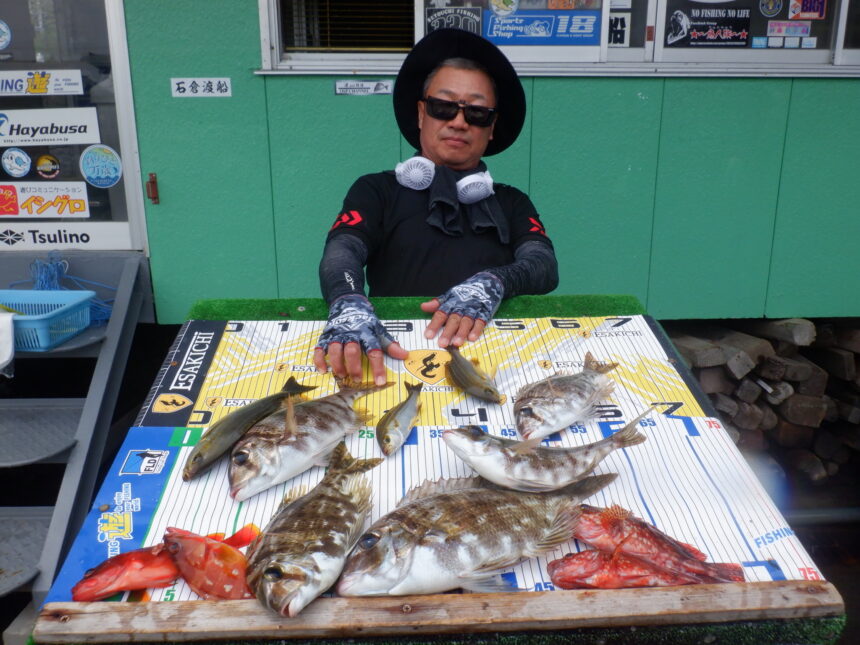 船外機ボートで松原さんがメイチ40cmまでとアカハタ、カサゴをゲット。