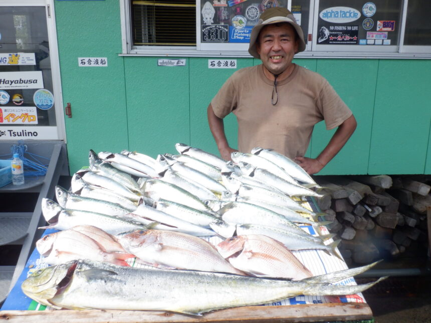 船外機ボートで平田さんがシイラ、マダイ、サバをゲット。
