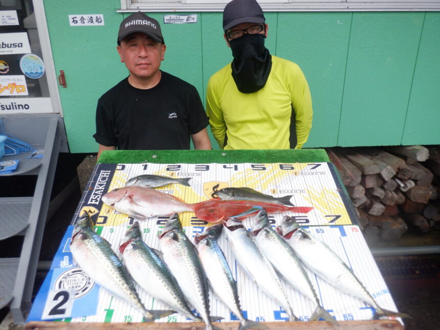 船外機ボートで佐藤さんがサバ、ホウボウ、マダイ、グレをゲット。