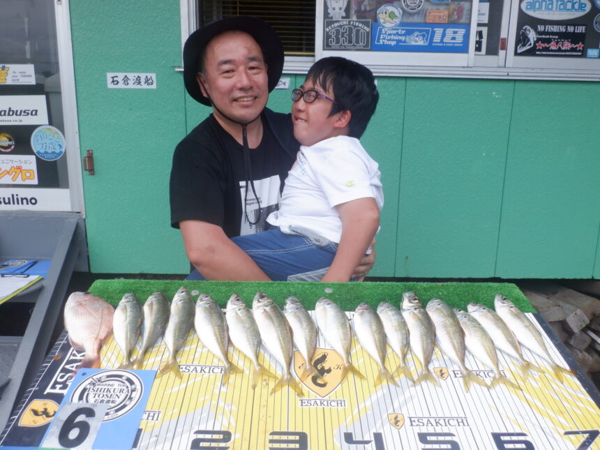 船外機ボートでたける君、りょうたろう君、じゅんぺい君がマダイ、カイワリ、ホウボウ、アジをゲット。