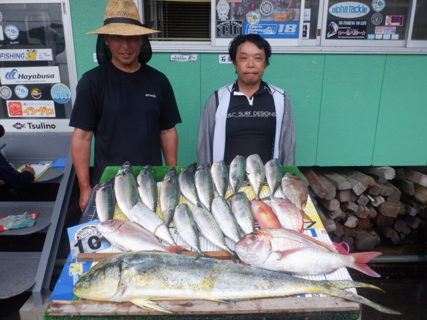 船外機ボートで三宅さんがマダイ、サバ、シイラをゲット。