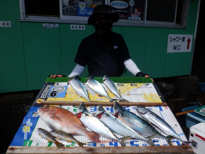 船外機ボートで鈴木さんがサバ、マダイ、ソウダカツオをゲット。