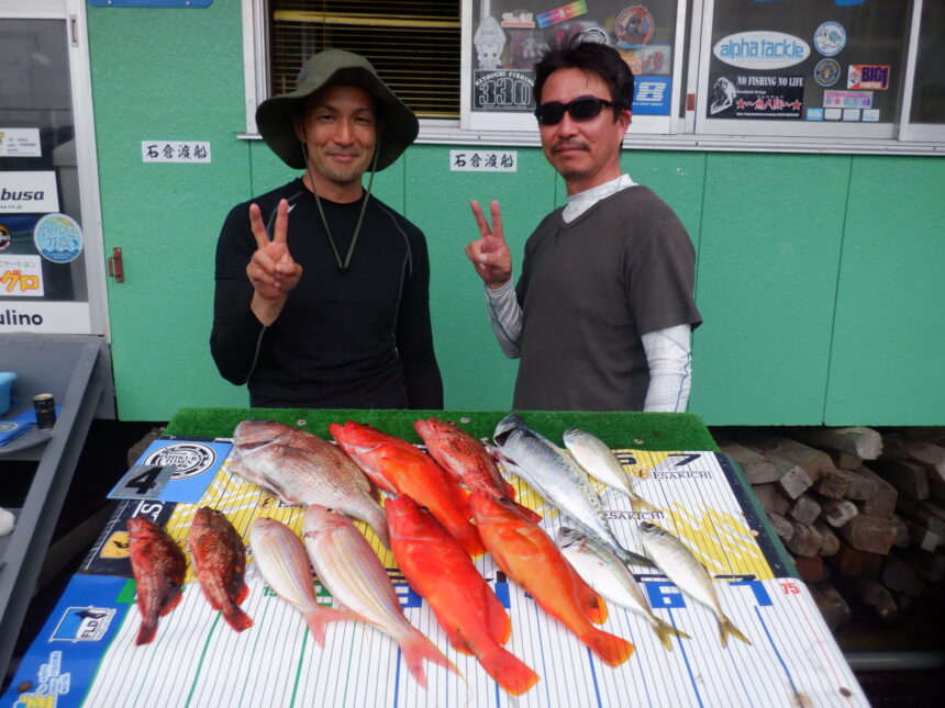 船外機ボートで奥山さんがマダイ、アカハタ、イトヨリ、カサゴ、アジをゲット。