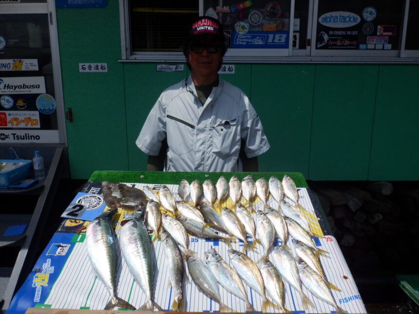 船外機ボートで亀井さんがアジ、サバ、カワハギをゲット。
