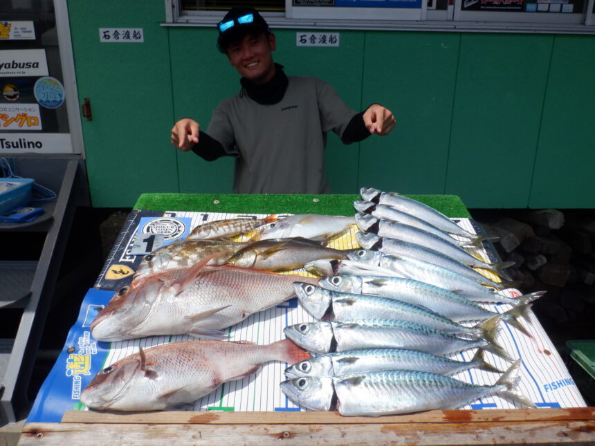船外機ボートで相羽さんがマダイ57cmまでとサバ、メイチ、イサキをゲット。