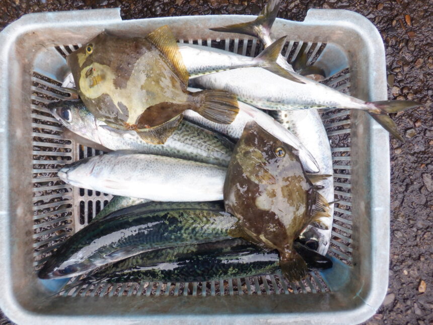 船外機ボートで大嶋さんがサバ、カワハギをゲット。
