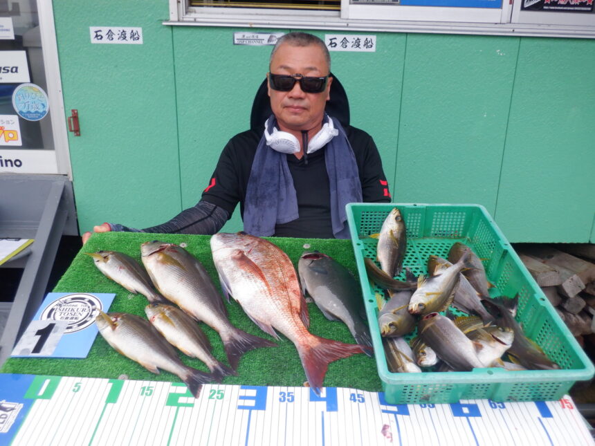 船外機ボートで松原さんがマダイ46cm、イサキ40cmまで、グレをゲット。
