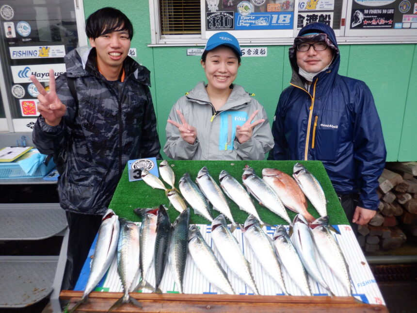 船外機ボートで加藤さんがマダイ、サバ、アジをゲット。
