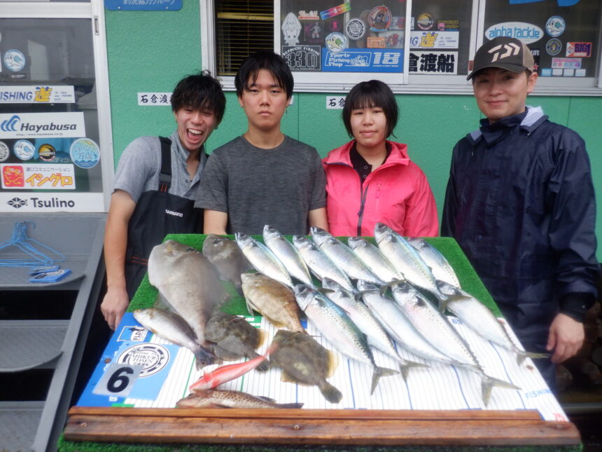 船外機ボートで目片さんがメイチ、ウスバハギ、イサキ、カワハギ、サバをゲット。