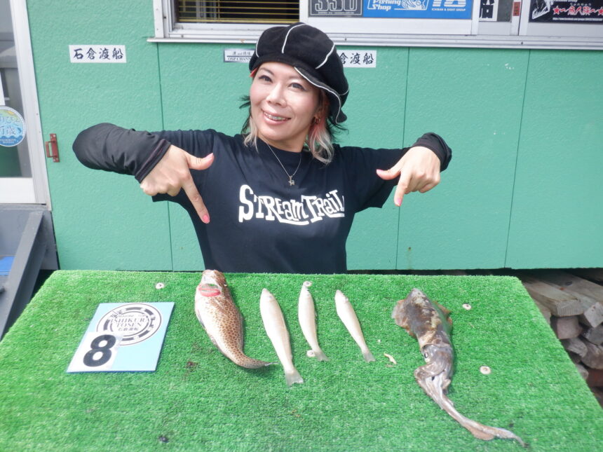 船外機ボートでトモチンさんがキス、オオモンハタ、アオリイカをゲット。