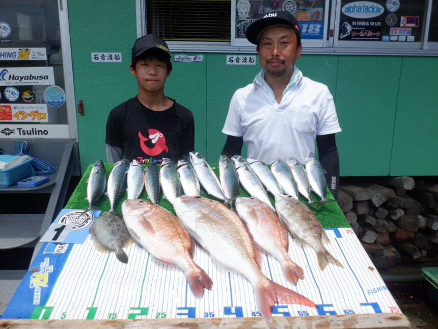 船外機ボートで椋野さんがマダイ51cmまでとサバ、カワハギをゲット。