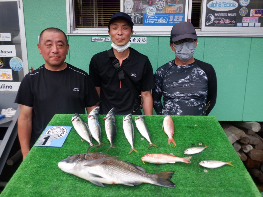 船外機ボートで佐藤さんがチヌ43cm、サバ、アジをゲット。