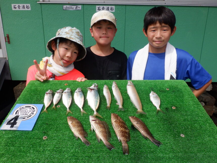 船外機ボートでそうは君、いぶき君、はるま君がキス27cm、アジ、オオモンハタをゲット。
