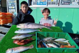 船外機ボートでのあ君&けんすけ君がツバス、イサキ、カサゴ、シロアマダイ、ボラ、アジをゲット。
