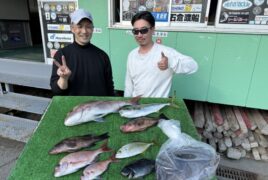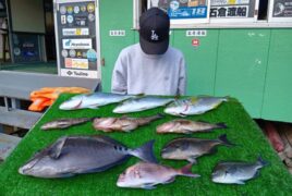 船外機ボートで奥山さんがマダイ、ツバス、オオモンハタをゲット。